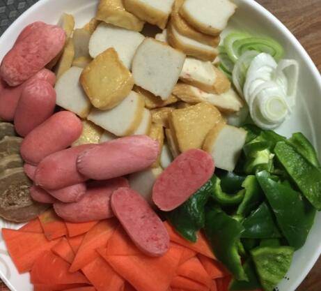 胡萝卜、青椒、丸子切片,丸子和胡萝卜用清水煮8分熟。