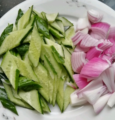 黄瓜切菱形片,洋葱切菱形片。