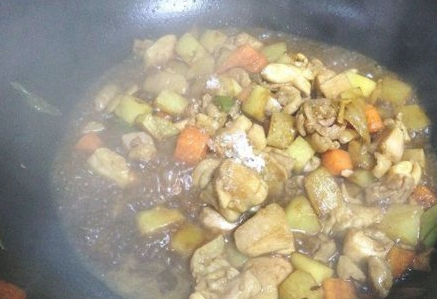 倒入炒过的土豆丁、胡萝卜丁,加入盐、糖、料酒、开水煮开2-3分钟;