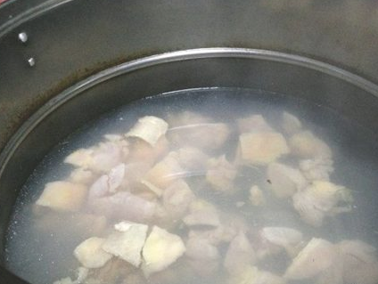 锅内加水烧开后关火,放入鸡丁浸泡两分钟后捞出沥干;