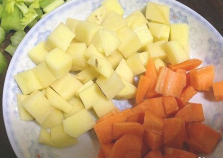 胡萝卜、土豆、芹菜切丁备用;