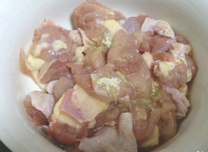 鸡边腿洗干净去骨切丁加入盐、白胡椒粉、料酒捉匀腌制20分钟;