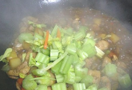 看到汤汁变的微稠时倒入芹菜丁煮开即可出锅。
