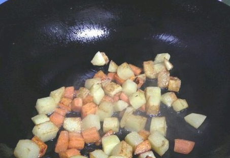 锅内加油(稍多)倒入土豆丁、胡萝卜煸炒至表面微黄即可,捞出备用;