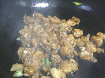 原锅炒香葱碎,倒入鸡丁,加入红烧酱油翻炒均匀上色;