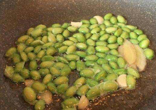 2、生姜和蒜头放入油锅中炒香,放入豆子翻炒变色。