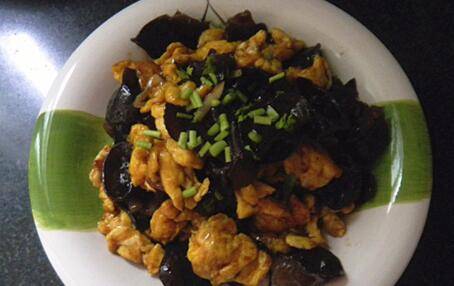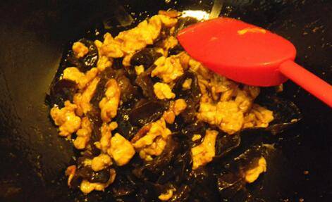 5、倒入发好的木耳和炒熟的鸡蛋,煸炒。