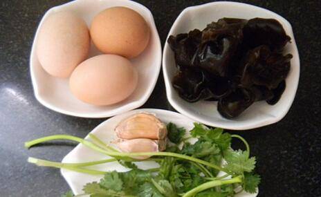 用料:鸡蛋3个、木耳30克、食用油10克、食盐2克、生抽2小勺、香醋3小勺、白糖1小勺、干淀粉1小勺、蒜2瓣、香菜15克。