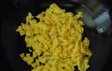 3、炒锅内倒入食用油,油温六成热倒入打散的蛋液,炒散后盛出备用。