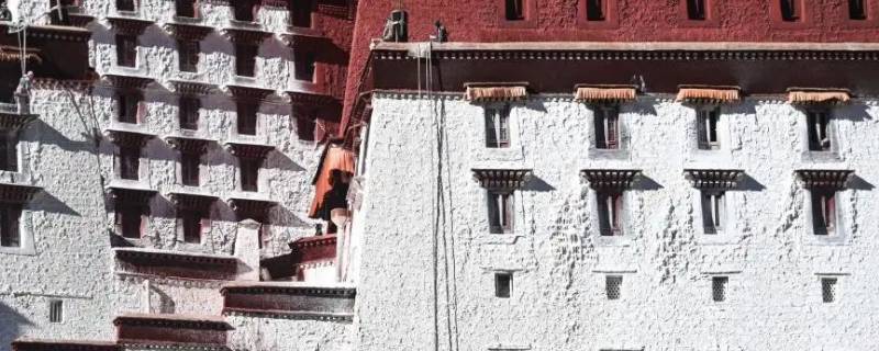 布达拉宫的墙是用白石灰、牛奶和白糖、蜂蜜以及藏红花等多种调料配制而成的涂料进行粉刷的。由于这种特制的涂料具有保鲜、粘度高的特点,是布达拉宫的传统涂料,除了布达拉宫,西藏的许多寺庙都会用到这种涂料。