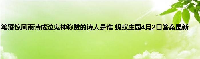 蚂蚁庄园每天都会给玩家们带来一些答题活动,这些题目都是和玩家的一些生活相关,有些还是一些诗词的题目,4月2日最新题目就是笔落惊风雨诗成泣鬼神称赞的诗人是谁?这是一道诗词相关的题目,很多玩家不知道答案了,那下面就让小编给玩家们带来4月2日蚂蚁庄园答案的介绍吧。