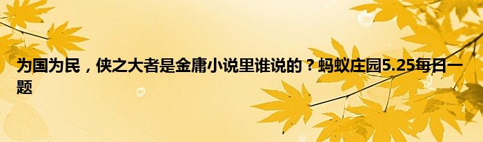 今天是5月25日,今天蚂蚁庄园问题已经出来了,其中有一个问题问到了有关金庸先生小说中的一句经典语句,也是大家经常说的一句“侠之大者,为国为民”,也是金庸小说中对于大侠的定义,那么这句话是谁的呢,一起来看看详细的答案吧。