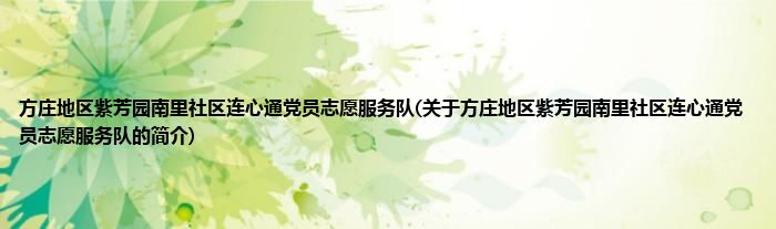 1、 方庄地区紫芳园南里社区连心通党员志愿服务队是由方庄地区连心通党员志愿服务队领导下的志愿团体。