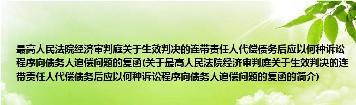 本文关于最高人民法院经济审判庭关于生效判决的连带责任人代偿债务后应以何种诉讼程序向债务人追偿问题的复函的简介就讲解完毕,希望对大家有所帮助。